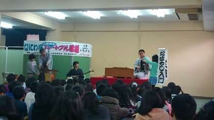 ワークショップとして、6年生児童代表と教員一名がみんなの前で短い落語を披露しました。堂々とした発表に、みんなが拍手!