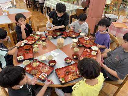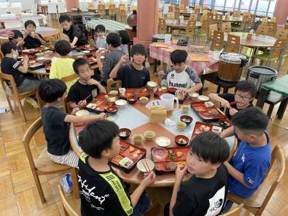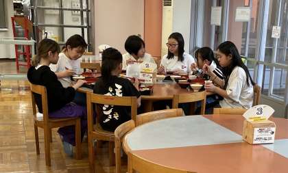 グループごとに円卓に座り、楽しく会話を弾ませながら夕食を食べています。