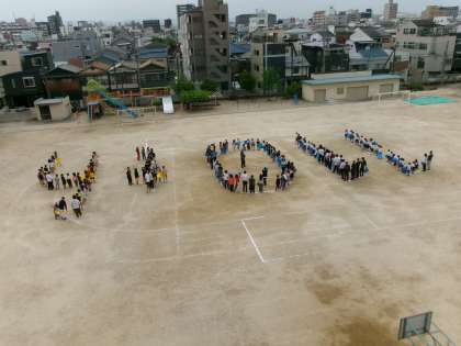 学級写真と航空写真(人文字で110th)を撮影している様子です。