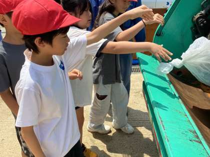 4年生は、環境事業センターからきたパッカー車にごみを入れたり、機械を動かしたりしました!パッカー車がどのようにごみを小さくしているのかを、興味津々で見ていました!