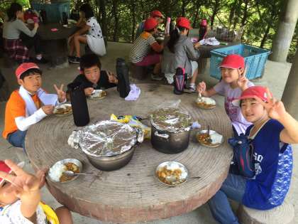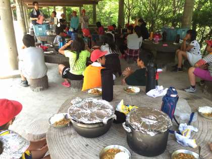 野菜を洗って切る子、火を起こし火のもりをする子、米を洗い水加減を見る子、食器を洗い整える子、手順を確認する子、ゴミを集める子、煮る時間や煮え具合を見る子などなど、協力して作りました。味はどうだったでしょうか?
