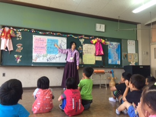 日本から近くにある「韓国・朝鮮」のあいさつや衣服、遊びを教えてもらいました。