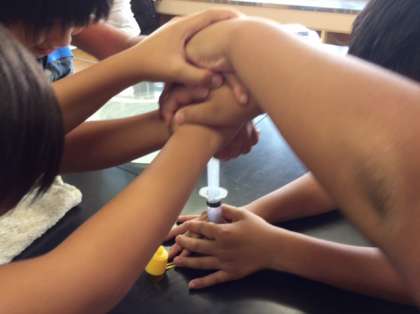 実験では、班のみんなで協力して水を入れたり、実験道具を押してみたりと、意欲的に取り組みましたヽ(^。^)ノ