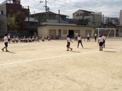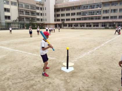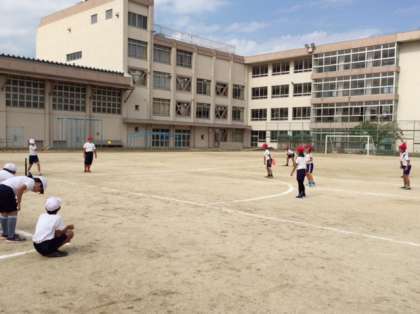 10月6日にオリックスバファローズの方々にゲストティーチャーとして来校していただいたときに教わったことを活かして、打ったり、守ったりと元気に活動しています(^o^)丿