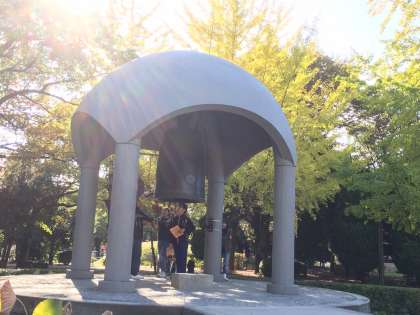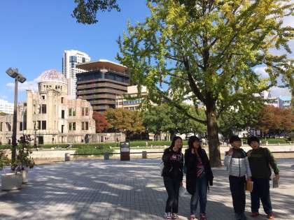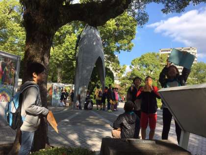 平和公園内にある史跡や思いが込められた碑などをグループで周り、タブレットで記録したり声を出して読んだりし、たくさんのことを学びました。