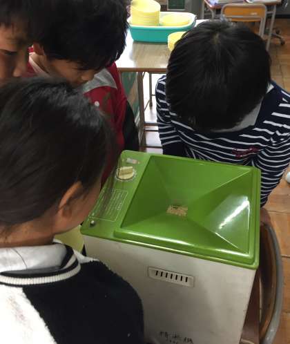 まずひとつめは「ごはん」です。今回使用したお米は、子どもたちが今年の6月に田植え・10月に稲刈りを実際に行った、泉佐野市下瓦屋から届いたお米です。届いた時点では玄米の状態だったので、調理実習の前日に、精米機を用いて精米にする作業を全員で行いました。精米し終わったお米の温かさに、みんな大きな声が上がっていました。本当はもみ殻を取るときの摩擦の熱なのですが、子どもたちには米作りに関わったたくさんの人たちの思いがこもったぬくもりだということを伝えています。
