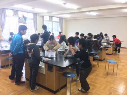 フラスコの口に石鹸の膜を張りフラスコを温めるとどうなるのかを実験しました。何が起こるのか興味津々の子どもたちで、シャボン玉ができあがると「うわー!」っと声を出して喜んでいる子がたくさんいました。