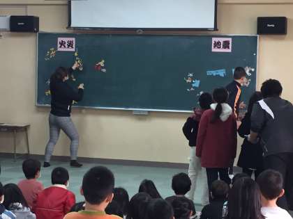 まず中学生がクマモンダンスを披露して、それをみんなでを踊りました。そのあと小学生VS教師の災害パズルゲーム大会で場を盛り上げてくれました。