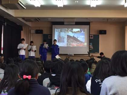 今回の土曜授業では地震の避難訓練のあと、鶴見橋中学校の「子ども防災プロジェクト」の生徒の皆さんが「熊本地震」のお話をしてくれました。