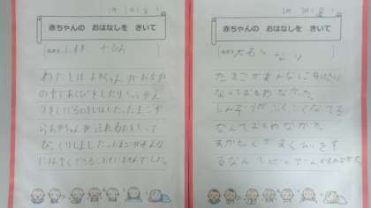 お母さんからの栄養と、羊水に守られて大切に育てられた様子を話していきました。