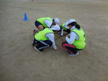 (男女比や経験者・未経験者を考えてチームを組み試合をする。)