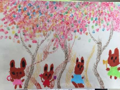 「森の中の演奏会」と題されたこの絵は、指先を使って葉っぱを一枚一枚ていねいに描きました。