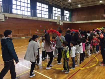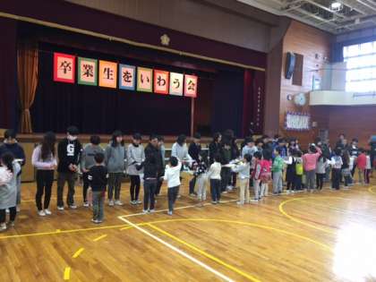 1年生から5年生、そして教職員のみんなに卒業をいわってもらった6年生。