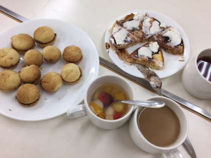 フルーツポンチやパンケーキ、クッキーや大福など、班で協力して調理しました。作ったスイーツを食べながら、面白い出し物を・・