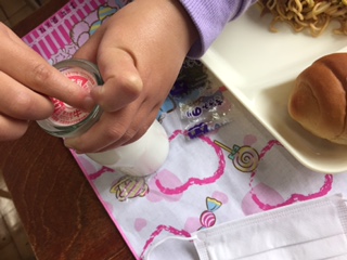 牛乳のフタを開けるのも1年生にとっては大仕事。