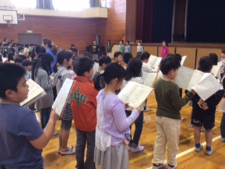 教室で熱唱した後、講堂にみんなで集まり、6年生を中心に歌いました。