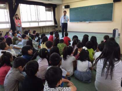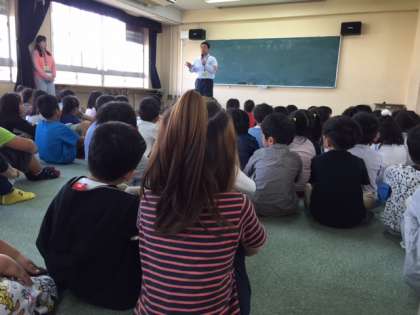 今日は初めて、4階多目的室での児童朝会でした。
