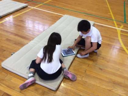 前転・せしじ倒立・頭倒立の3つの技を、一人が練習、一人が補助、一人がタブレットで撮影を担当し、自分たちで上達するように話し合っていました。