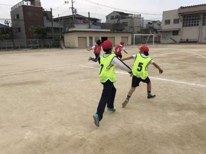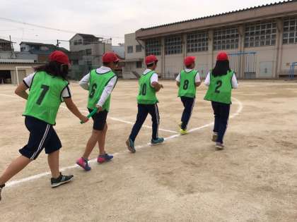 6年生、最初の体育では陸上競技のリレーをしています。各チームに分かれて、毎時間の最後にタイムを計測し、記録を縮めることを目標にしています。リレーのコツは、ズバリバトンパス!!できるだけスピードを落とさないようにするためには、どのようにバトンパスをすればよいのかをチームで考えながら取り組んでいます!
