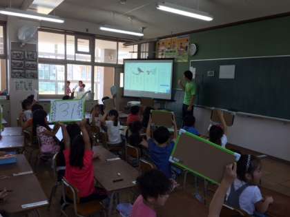先週、今日に備えて前回の復習を行いました。1年生はまだひらがなもすべて学習し終えていないので、難しい問題もあるのですが、2人組になってホワイトボードを使った復習。