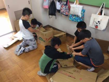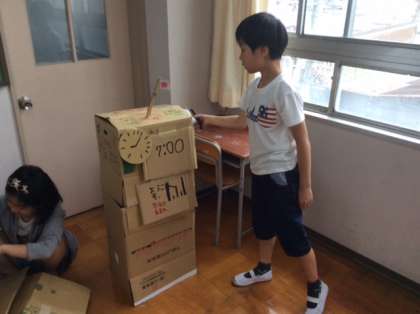 図工の授業では、段ボールを使って、自分たちのまちを作りました。なかよし文化祭でも活用しようと子供たちは、友達と協力し合って意欲的にまち作りに取り組みました。ビニール袋を使って窓を作ったり、ギザギザの部分で洗濯板を作ったりと、アイディアあふれる建物が出来上がりました。