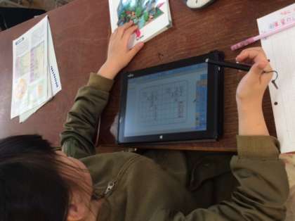 1人1台タブレットを配り、わり算の筆算のまちがいやこれまでに習った筆算との違いについて、タブレットに書き込みました。