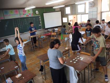 本日はクラスで百人一首を行いました。『瀬をはやみ 岩にせかるる 滝川の われてもすゑに あはむとぞ思う』という一首を題材として取り上げました。昔の文(古文)から現在の日本語に直す活動(現代語訳)をしました。子どもたちは古文から様々な情景を想像しながら現代語訳を考えていました。その後は、百人一首を1対1で行いました。競技かるたのルールで行いました。残り1枚と1枚の勝負(運命戦)までもつれるペアもありとても楽しい活動となりました。