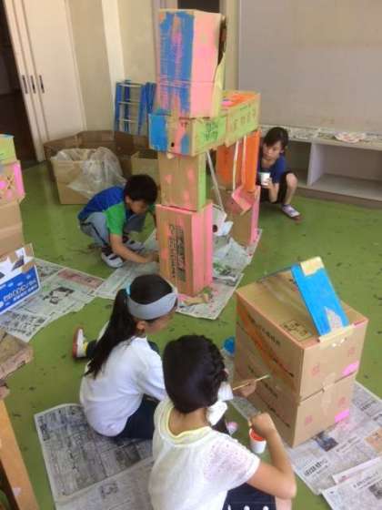 今日の図工の時間、ゆめのまちの作品に色をぬるために、図工室に移動しました。
