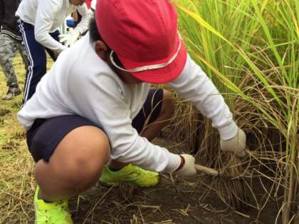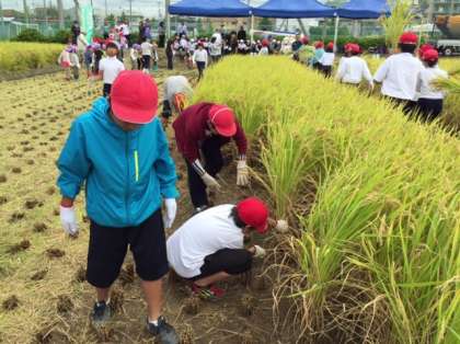 そんな田んぼを、長橋小の5年生と泉佐野市の長坂小5年生とで力を合わせて穂を刈っていきました。初めて使う鎌は難しく四苦八苦していましたが、最後は慣れたものでどんどん進んでいきました。