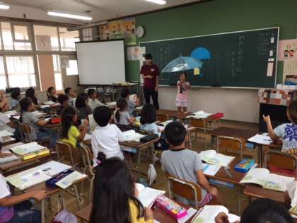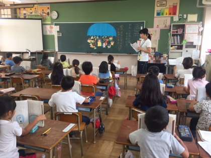 教室で実際に、傘を「くるくるくるる」と回したり、黒板に掲示された傘にどんな動物が入るのかをみんなで確認したり・・とっても楽しい授業でした。