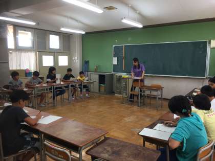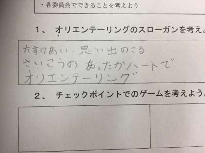 です。実はこのスローガンにはリズムがあります!短歌のように五 七 五 七 七のリズムで読んでみてください!さん、はい!どうですか、覚えやすくなったでしょう?子どもたちはこれからも何度も集まりオリエンテーリングに向けて頑張ります!応援よろしくお願いします!