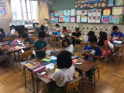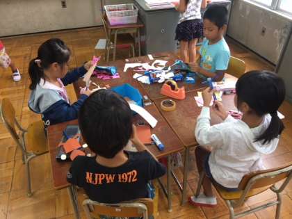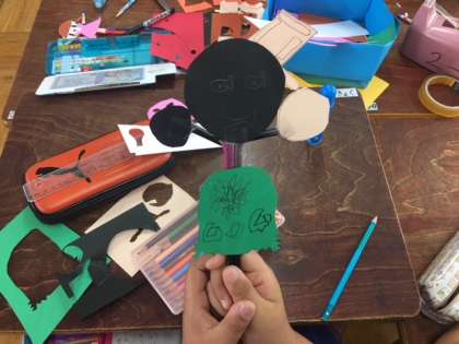 図工の時間にストローを使って人形を作りました。ストローを引っ張ると、あら不思議!手が動きます。