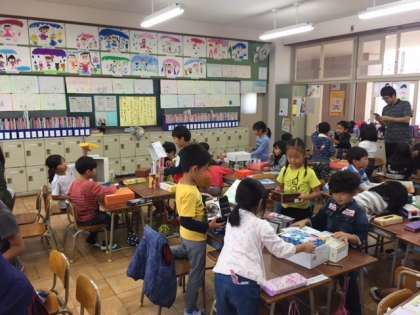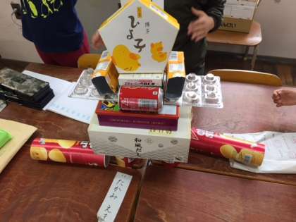 導入で、いろんな形の箱や缶などを使って、いろいろなものを作りました。