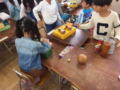 いろんな形の箱や缶などを、なかまにわけているところです。