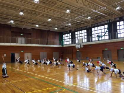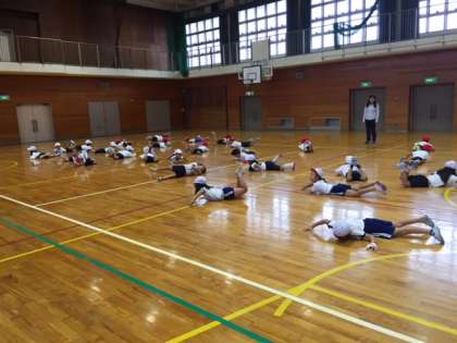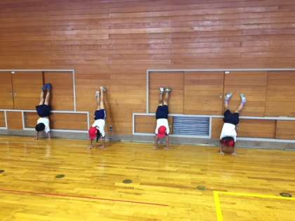 体育の時間に、みんなでかっこいいポーズをしてみたり、お腹でぐるぐる回ったり、逆立ちをしたりしました。