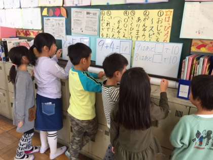 教室の後ろにはホワイトボードに書かれた問題があります。休み時間には問題の前に列ができています!!みんなでたしざん頑張っています☆