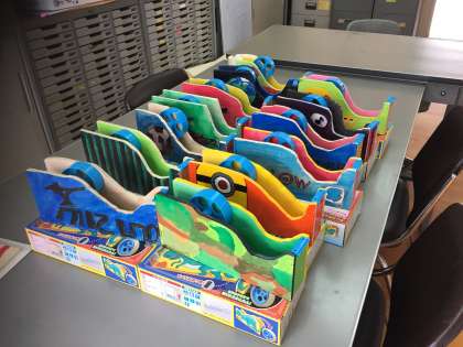以前より作成していた、テープカッターがとうとう完成しました!使用している色、書いている絵、形も様々な形があり、個性豊かな作品が誕生しました!時間をかけて完成させたので、とても思い出に残るものになりました!