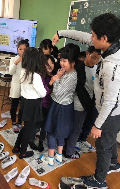 算数の「面積」の学習で、1平方メートルの広さに何人入ることができるか1平方メートルに貼り合わせた敷新聞紙に乗って、実験しました。