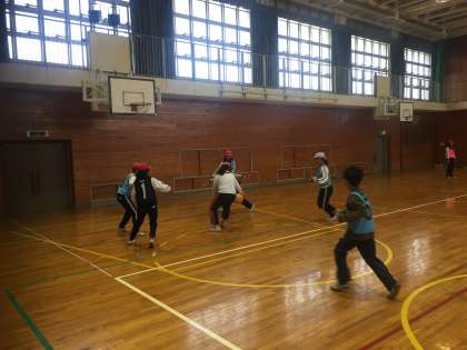 バスケットボールの授業も本日で4回目となりました。今回、子どもたちはバスケのディフェンスについて学びました。「どんなディフェンスを相手にされたらしんどいか」ということからどんなディフェンスをするのが良いか考えました。「ずっとマークすること」「一定の距離を保つこと」「ステップを素早くすること」が大切と子どもたちは気づくことができました。その動きを意識して、試合をしました。