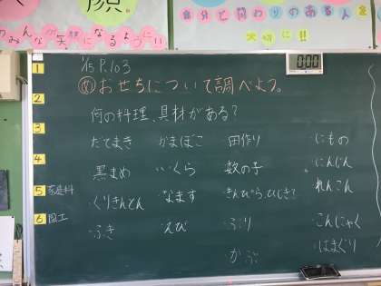 3学期初めての家庭科は、おせち料理を調べました!まず、おせち料理にはどんな料理や、食材が使用されているか考えました。子どもたちは今までの体験、または給食等を頼りにして考えていました。子どもたちからは『だてまき』『れんこん』などの意見がでました。そして、おせち料理で食べる物には、お正月らしい縁起が良い理由があることを知りました。次回は食材一つひとつ理由を調べます!どんな理由があるのか楽しみですね!