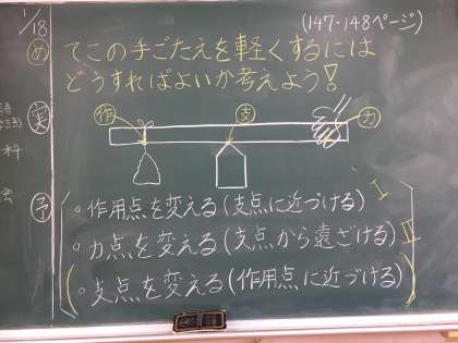 本日の6年生の理科は、「てこの手ごたえを軽くするにはどうしたらよいか」というめあてで学習をすすめました。子どもたちからは、『作用点を支点に近づけたら・・・』『力点、支点の位置を変えたら・・・』と様々予想がでました。次回の理科の実験で実際に、てこの手ごたえを感じながら結果を導き出します。重たいおもりだけどみなざん頑張りましょう!