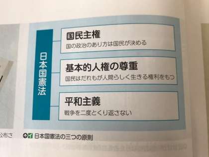 その中で、これまでの歴史の分野(戦後の日本)でも出てきた『日本国憲法』について詳しく学習しています。とくに日本国憲法の三つの原則、「国民主権」「基本的人権の尊重」「平和主義(戦争放棄)」をしっかりとおさえ、それぞれについての意味を考えて、理解を深めています!