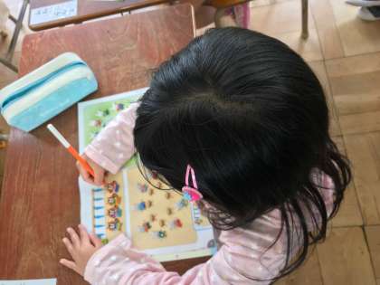 算数の授業で、なかまを線でつなげたり、数を比べたりしながら、どちらが多いか調べる学習をしました。