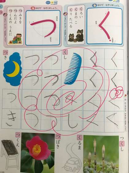 国語の授業でひらがなを学習しました。今日は、「く」と「つ」の2文字です。