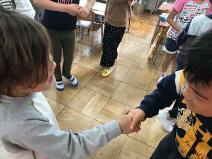 音楽の時間は、子どもたちの明るい歌声が教室に響き渡ります。今日は歌を歌いながら、友だちと握手をしたり、ぞうの歩き方をまねしたりと、体を動かして音楽に親しみました。
