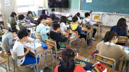 図画工作科の時間、前回の授業で彩色した画用紙を切り、もよう作りに励みました。さまざまな組み合わせを楽しみながら、みんな思い思いの作品をつくっています。完成が楽しみです。