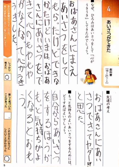 今日の道徳の授業で、「あいさつができた」という話を読みました。