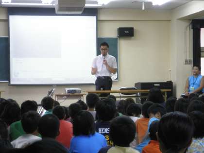 5時間目は、1〜6年生の前でお話をしていただきました。