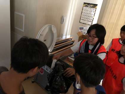 児童は、ダンボールでベッドを作ったり、災害時用の簡易トイレを組み立てたり、車いすの体験をしたりしました。普段は体験できない事なので、とても興味をもって取り組んでいました。