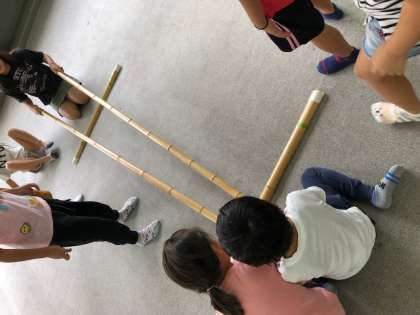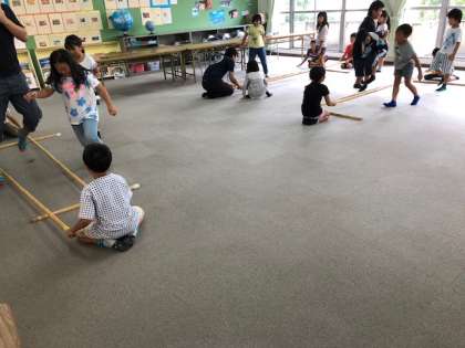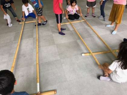 3拍子のリズムに合わせて、竹を使ったフィリピンの遊び「テニックリング」をしました。